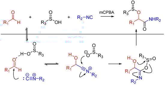 Soeta et al. also reported the one-pot synthesis of α-(sulfonyloxy)amide derivatives using an oxidative Passerini reaction. An aldehyde, an isocyanide and sulfinic acid were reacted, followed by the addition of meta-chloroperoxybenzoic acid giving the products in high yields (Scheme 5). The reaction has a wide scope on aldehydes and isocyanides [].