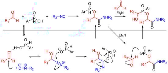 The same group reported a Passerini/Pudovik type reaction between aldehydes, isocyanides and phosphinic acids leading to α-(phosphinyloxy)amide derivatives. This report is the first instance of an isocyanide-based MCR using phosphinic acid instead of a carboxylic acid as a reactant. The nucleophilic phosphinate group undergoes a subsequent catalytic Pudovik-type reaction, affording the products in good yields (Scheme 6) [].