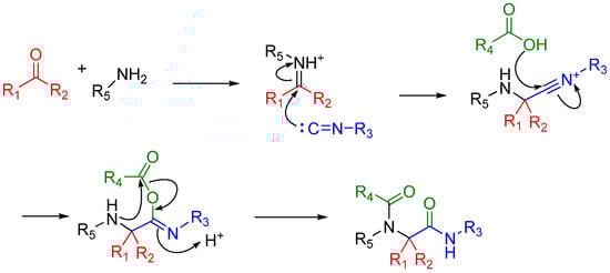 - El Kaim, L.; Grimaud, L. Beyond the ugi reaction: Less conventional interactions between isocyanides and iminium species. Tetrahedron 2009, 65, 2153–2171. [Google Scholar] [CrossRef]