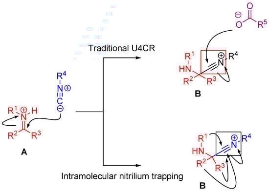 In nitrilium trapping reactions, an external or intramolecular nucleophile attacks the nitrilium species (B).