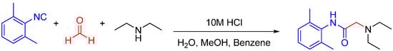 The traditional Ugi reaction utilizes a carboxylic acid as the fourth component in trapping the nitrilium ion. In the absence of a carboxylic acid, water can act as the nucleophilic partner too. One well-known example of utilizing the Ugi reaction in bioactive molecule synthesis is the synthesis of the local anesthetic lidocaine (Scheme 10) []. Trapping of nitrilium ion by water is usually carried out under acidic conditions [,].