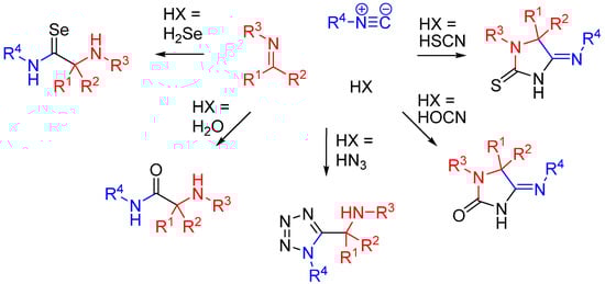 Besides carboxylic acids, hydrazoic acid, HOCN, HSCN, and H2Se are some other external nucleophiles which participate as the fourth component in a U4CR (Scheme 11) [].