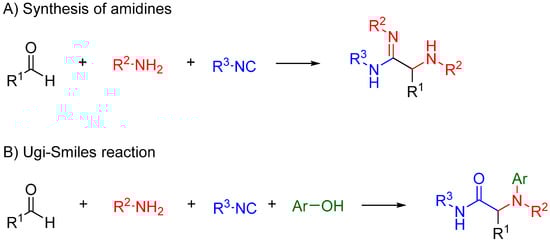 Nitrilium trapping by primary amines leads to the synthesis of amidines [] (Scheme 12A), while with electron deficient phenols leads to N-aryl amines [,] (Ugi-Smiles coupling, Scheme 12B).