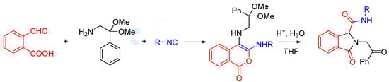 In the case where both an aldehyde and a carboxylic acid are present on the same molecule, as in 2-formylbenzoic acid, it has been shown that the carboxylic acid will trap the nitrilium ion []. Whereas an U4CR yields a linear scaffold, this trapping generates a cyclic product. This has been utilized for the rapid and high-yielding synthesis of functionalized isocoumarins, such as the anticoagulant warfarin (Scheme 13). Treatment of the product with a catalytic amount of acid led to an isomerization to the expected product.