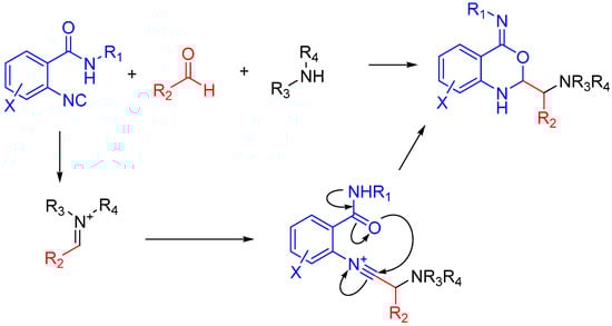 - Bonne, D.; Dekhane, M.; Zhu, J. Exploiting the dual reactivity of o-isocyanobenzamide: Three-component synthesis of 4-imino-4H-3,1-benzoxazines. Org. Lett. 2005, 7, 5285–5288. [Google Scholar] [CrossRef] [PubMed]