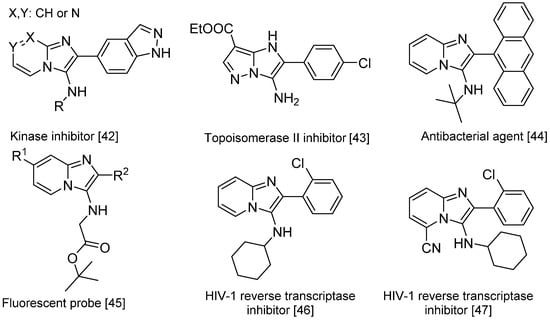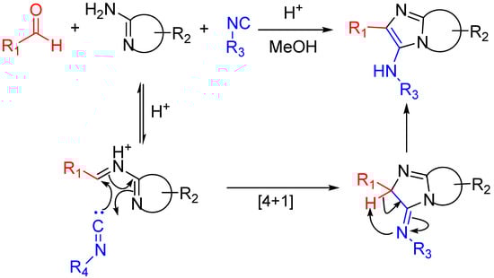 The Groebke-Blackburn-Bienaymé reaction [,,] yields 3-aminoimidizoles in a non-concerted [4 + 1] reaction between an imine formed by the reaction between an aldehyde and an amine, and an isocyanide. The heterocyclic nitrogen traps the nitrilium ion, which leads to the formation of an imidazole ring following a rearrangement (Scheme 15). This reaction is widely used for the generation of highly diverse small molecule libraries [,]; the bioactive compounds synthesized this way include kinase inhibitors [], topoisomerase II inhibitors [], antibacterials effective against methicillin-resistant Staphylococcus aureus [], fluorescent probes [] and HIV-1 reverse transcriptase inhibitors (Scheme 16) [,].