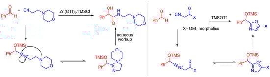When an aldehyde and 4-morpholinepropionitrile are combined in the presence of trimethylsilyltriflate, the aldehyde is trapped by the TMS group and the morpholino nitrogen stabilizes the nitrilium ion (Scheme 17). The trimethylsilyltriflate coordinates to and activates the aldehyde to attack by an isocyanide, similar to how the carboxylic acid normally activates the aldehyde through hydrogen bonding. If a ketone is present on the α-carbon of the isocyanide, the reaction can yield a cyclized product as well [].