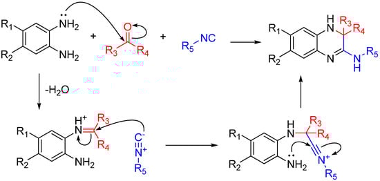 - Shaabani, A.; Maleki, A.; Mofakham, H.; Khavasi, H.R. Novel isocyanide-based three-component synthesis of 3,4-dihydroquinoxalin-2-amine derivatives. J. Comb. Chem. 2008, 10, 323–326. [Google Scholar] [CrossRef] [PubMed]