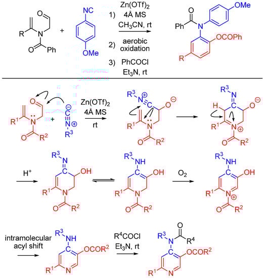 Lei and co-workers report a novel approach to synthesize pyridines []. The method features an unprecedented α-addition of aldehyde and enamide to an isocyanide. While not an Ugi reaction, this cycloaddition is an intriguing example of nitrilium trapping outside the realm of isocyanide-based MCRs. The cascade reaction involves a Zn(OTf)2-promoted [1 + 5] cycloaddition of the isocyanide with a substituted enamide, followed by the aerobic oxidative aromatization and intramolecular acyl transfer and finally an acylation by an external acyl chloride to yield 2-substituted 4-acylamino-5-acyloxypyridines (Scheme 20). The method provides a straightforward route to diversely substituted pyridines that are analogues of acetylcholinesterase inhibitors [].