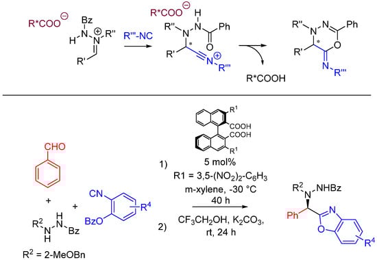 Achieving stereocontrol is among the current challenges of MCR chemistry. A recent example by Hashimoto et al. uses acyclic azomethine imines as prochiral electrophiles generated with catalytic amounts of axially chiral dicarboxylic acids []. The nitrilium intermediate following the attack of the isocyanide is trapped intramolecularly by the oxygen of the hydrazide. The imine is generated from benzaldehyde and N’-benzylbenzohydrazide in the presence of a chiral carboxylic acid. 2-benzoyloxyphenyl isocyanides [] are used for this reaction, and a one-pot basic hydrolysis is performed on the Ugi products to generate asymmetric benzoxazoles in high yield and ee (Scheme 21).