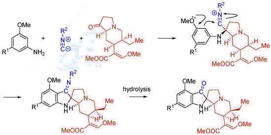 - Schneekloth, J.S.; Jimin, K., Jr.; Sorensen, E.J. An interrupted Ugi reaction enables the preparation of substituted indoxyls and aminoindoles. Tetrahedron 2009, 65, 3096–3101. [Google Scholar] [CrossRef] [PubMed]