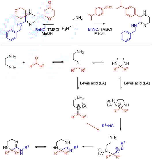 Kysil et al. report a multicomponent reaction between ethylenediamines, isocyanides, ketones and aldehydes that affords highly substituted 3,4,5,6-tetrahydropyrazin-2-amines, including spirocyclic compounds (Scheme 23) []. The tetrahydropyrazine ring is formed as a result of the intramolecular trapping of the nitrilium intermediate by the second ethylenediamine amino group and the subsequent tautomerization. The reaction is promoted by Lewis acids, particularly trimethylchlorosilane.