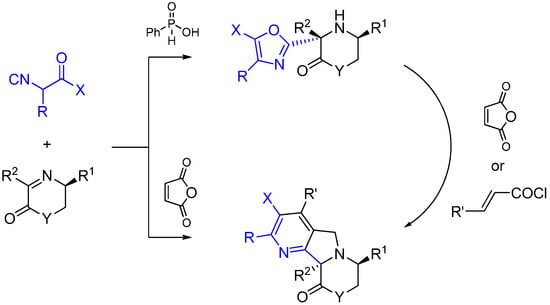 - Xia, L.; Li, S.; Chen, R.; Liu, K.; Chen, X. Catalytic ugi-type condensation of α-isocyanoacetamide and chiral cyclic imine: Access to asymmetric construction of several heterocycles. J. Org. Chem. 2013, 78, 3120–3131. [Google Scholar] [CrossRef] [PubMed]