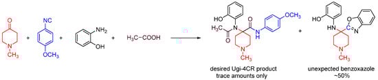 We discovered this reaction while performing a routine U4CR in 2,2,2-trifluoroethanol (TFE) between 2-aminophenol, N-methyl-4-piperidone, 4-methoxyphenyl isocyanide and acetic acid at 55 °C, we observed an unusual heterocyclic (benzo[d]oxazol-2-yl)-1-methylpiperidine product (benzoxazole, 1) along with the expected U4CR product seen only in trace amounts (Scheme 26).