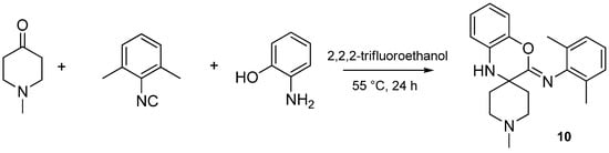 Isocyanides play an unusual role in this MCR, contributing only one carbon atom to the benzoxazole. The aryl or alkyl amine moiety acts as the leaving group, leading to an insertion of only the isocyanide carbon into the benzoxazole moiety. While investigating the effect of various isocyanides, we found that 2,6-dimethylphenyl isocyanide, instead of the expected benzoxazole, yielded a spiro[benzo[b][1,4]oxazine]-imine (benzoxazine, 10) scaffold when reacted with NMP and 2-aminophenol (Scheme 28). The isolation and structure elucidation of this benzoxazine derivative provided us the first clues about the mechanism of this reaction.