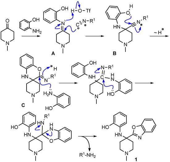 In the case of Ugi and Passerini reactions, an important intermediate in the mechanism is the reactive nitrilium. The mechanism of the Ugi reaction involves the nucleophilic attack of the isocyanide on the imine species (A) formed by the condensation of the amine and the ketone or aldehyde (Scheme 9). Lewis acids (such as TiCl4) are effective in aiding the formation of the imine by activating the aldehyde or ketone, thereby facilitating a nucleophilic attack by an amine []. The resulting nitrilium intermediate (B) itself is highly reactive as well and readily reacts with nucleophiles. In a traditional U4CR, the reaction partner of the nitrilium (B) is the carboxylic acid. Besides being a nucleophilic partner in the Ugi reaction, the carboxylic acid also plays a part in activating the nitrilium ion. Metal triflates have been shown to activate this nitrilium intermediate making them more susceptible to nucleophilic attack by carboxylic acids and thereby increasing rates of U4CR product formation by about two- to seven-fold []. However, when reactants with multiple nucleophilic groups (bisfunctional components) are used in the Ugi reaction, the nitrilium intermediate can be trapped by an intramolecular nucleophilic attack (Scheme 9).