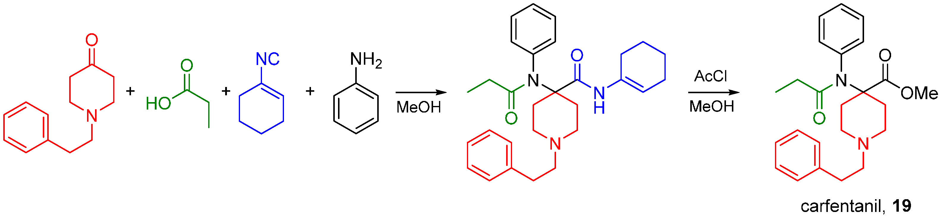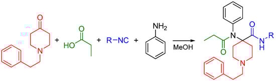 - Malaquin, S.; Jida, M.; Gesquiere, J.-C.; Deprez-Poulain, R.; Deprez, B.; Laconde, G. Ugi reaction for the synthesis of 4-aminopiperidine-4-carboxylic acid derivatives. Application to the synthesis of carfentanil and remifentanil. Tetrahedron Lett. 2010, 51, 2983–2985. [Google Scholar] [CrossRef]