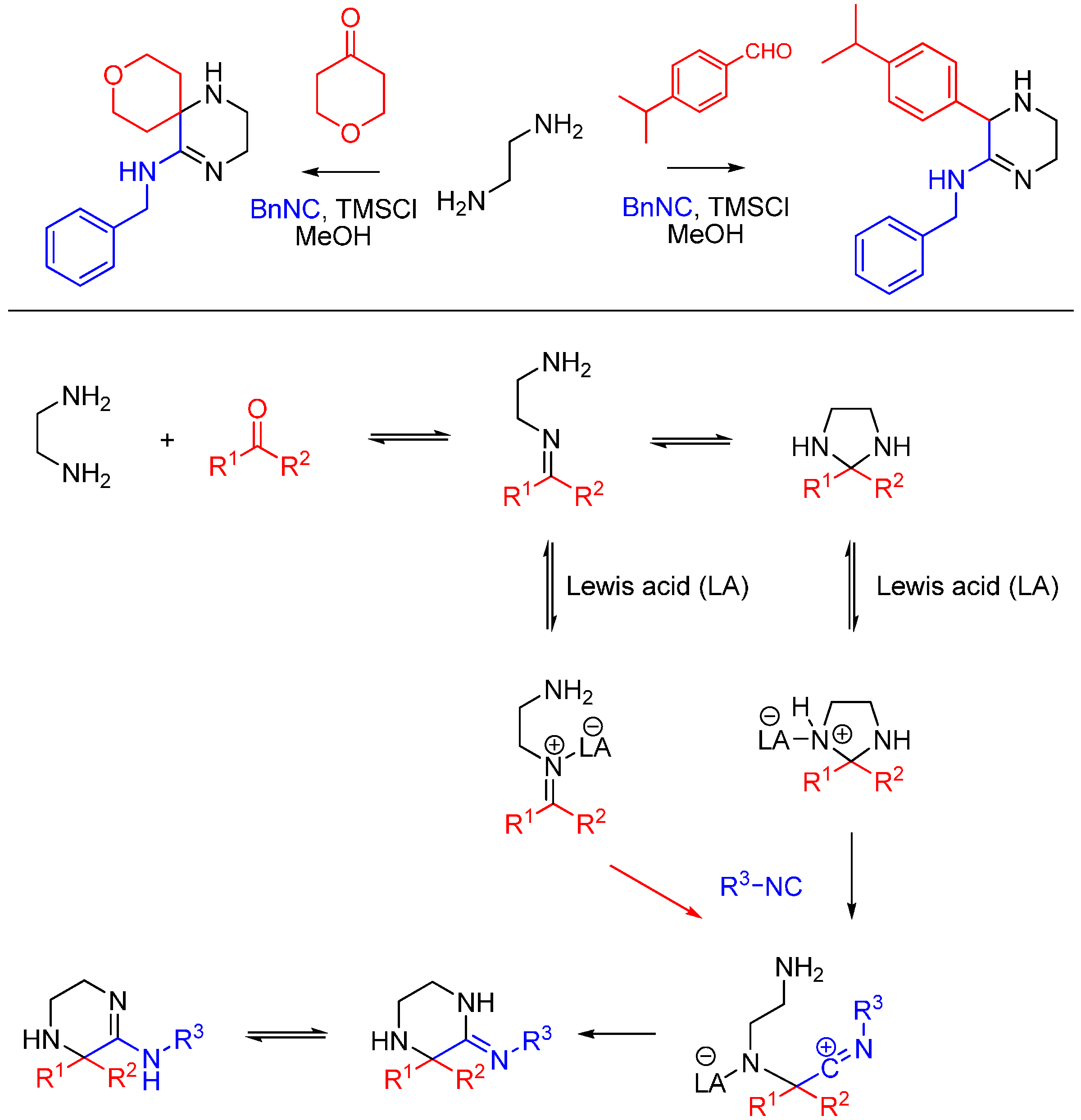 - Khan, A.T.; R, S.B.; Lal, M.; Mir, M.H. Formation of unexpected [small alpha]-amino amidine through three-component “Ugi condensation reaction”. RSC Adv. 2012, 2, 5506–5509. [Google Scholar] [CrossRef]
