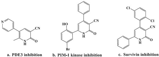 Various 3-cyano-2-oxopyridine derivatives with potential growth inhibitory and/or antiangiogenic actions through PDE3 inhibition (a); PIM-1 kinase inhibition (b); or survivin inhibition (c).