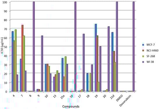 The in vitro cytotoxic activity the newly synthesized compounds against human breast cell line (MCF7), non-small cell lung cancer NCI-H460, CNS cancer SF-268 and WI 38 (normal fibroblast cells) were evaluated using doxorubicin as the reference drug, according to the method reported by Skehan et al. [35]. The IC50 values of the synthesized compounds compared to the reference drug are shown in Table 1.