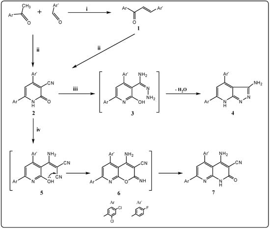 General methods for the preparation of compounds 2–7. Reagents and conditions: (i) NaOH/EtOH, stirring; (ii) ethyl cyanoacetate/CH3COONH4/EtOH, reflux; (iii) hydrazine hydrate 98% (1 mL)/EtOH, reflux; and (iv) malononitrile/triethylamine (3 mL)/EtOH, reflux.