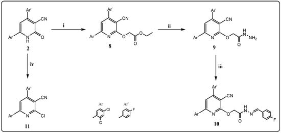 Ester derivative 8 were condensed with hydrazine hydrate (98%) in ethanol to give 2-[3-cyano-6-(2,4-dichlorophenyl)-4-(4-fluorophenyl)pyridin-2-yloxy]acetohydrazide (9) (Scheme 2), confirmed by its IR and NMR spectra. Its IR spectrum showed strong peaks at 3314, 3282 and 3116 cm−1 indicating the presence of a –NHNH2 group, and the NMR (1H and 13C) and mass spectra were also in accordance with its structure.