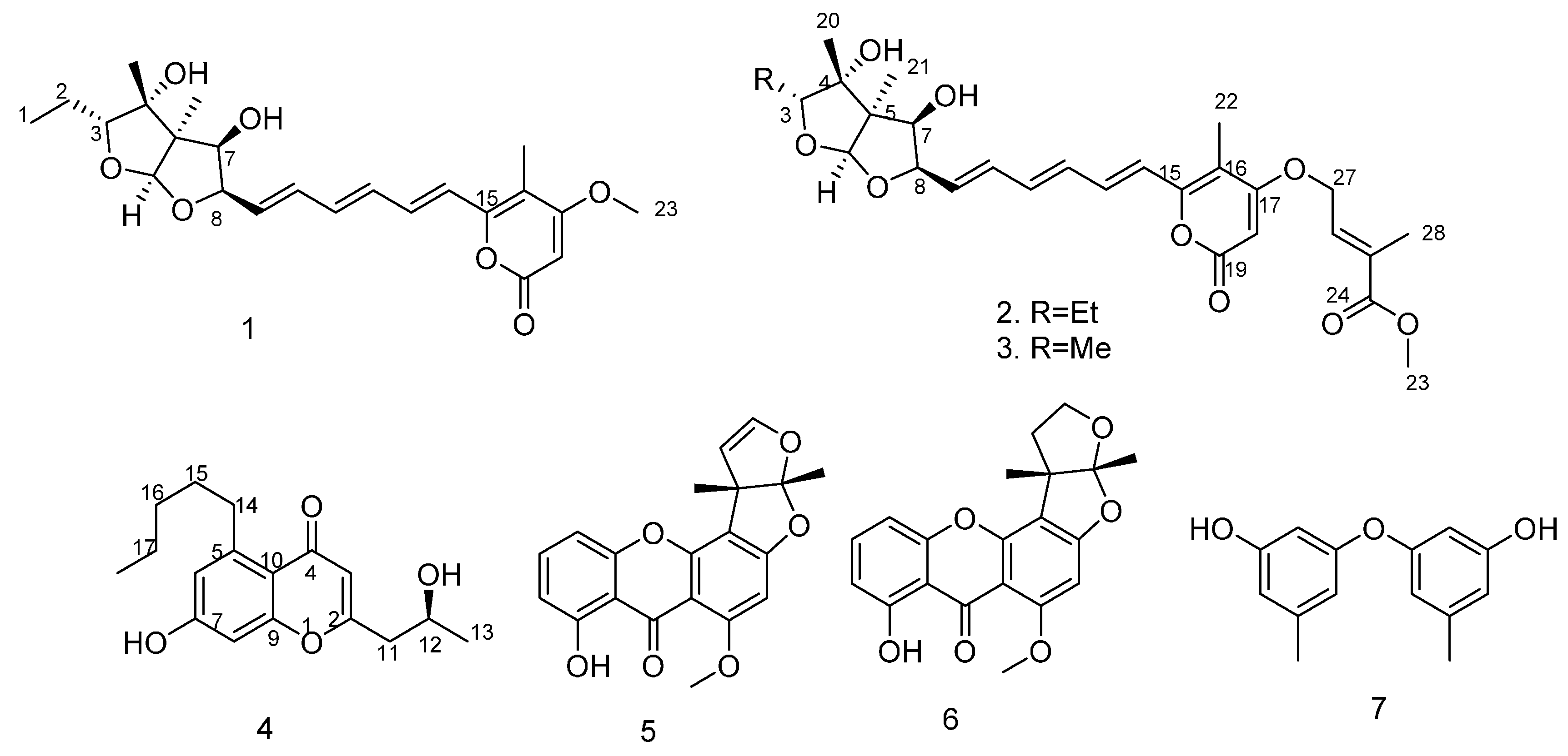 Marine sponge–derived fungus tends to produce structurally unique and biologically active natural products which have been documented in recent years; however, only a handful of reports have described new metabolites which have antiviral activities [7,8]. To further the scope of this particular research theme, a fungus, Aspergillus sp. SCSIO XWS02F40, attracted our attention because its crude EtOAc extract exhibited potential antiviral activity. Further isolation yielded three new compounds: asteltoxin E (2), asteltoxin F (3) and 7-hydroxy-2-(2-hydroxypropyl)-5-pentylchro mone (4), together with four known compounds: asteltoxin (1) [9], sterigmatocystin (5) [10,11], dihydrosterigmatocystin (6) [11,12], diorcinol (7) [13,14] (Figure 1). The antiviral (H1N1 and H3N2) activities of these compounds were individually evaluated. Herein, we described the isolation, structural elucidation, and bioactivity screening of these metabolites 17 from Aspergillus sp. SCSIO XWS02F40.