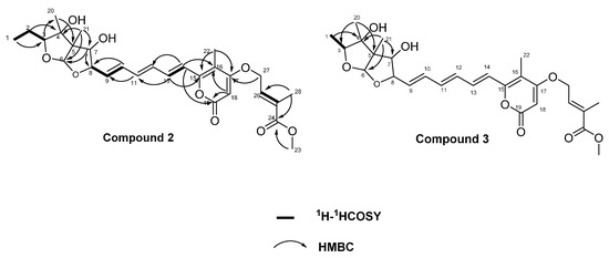 Figure 2. Selected 1H-1H COSY and HMBC correlations of 2 and 3.