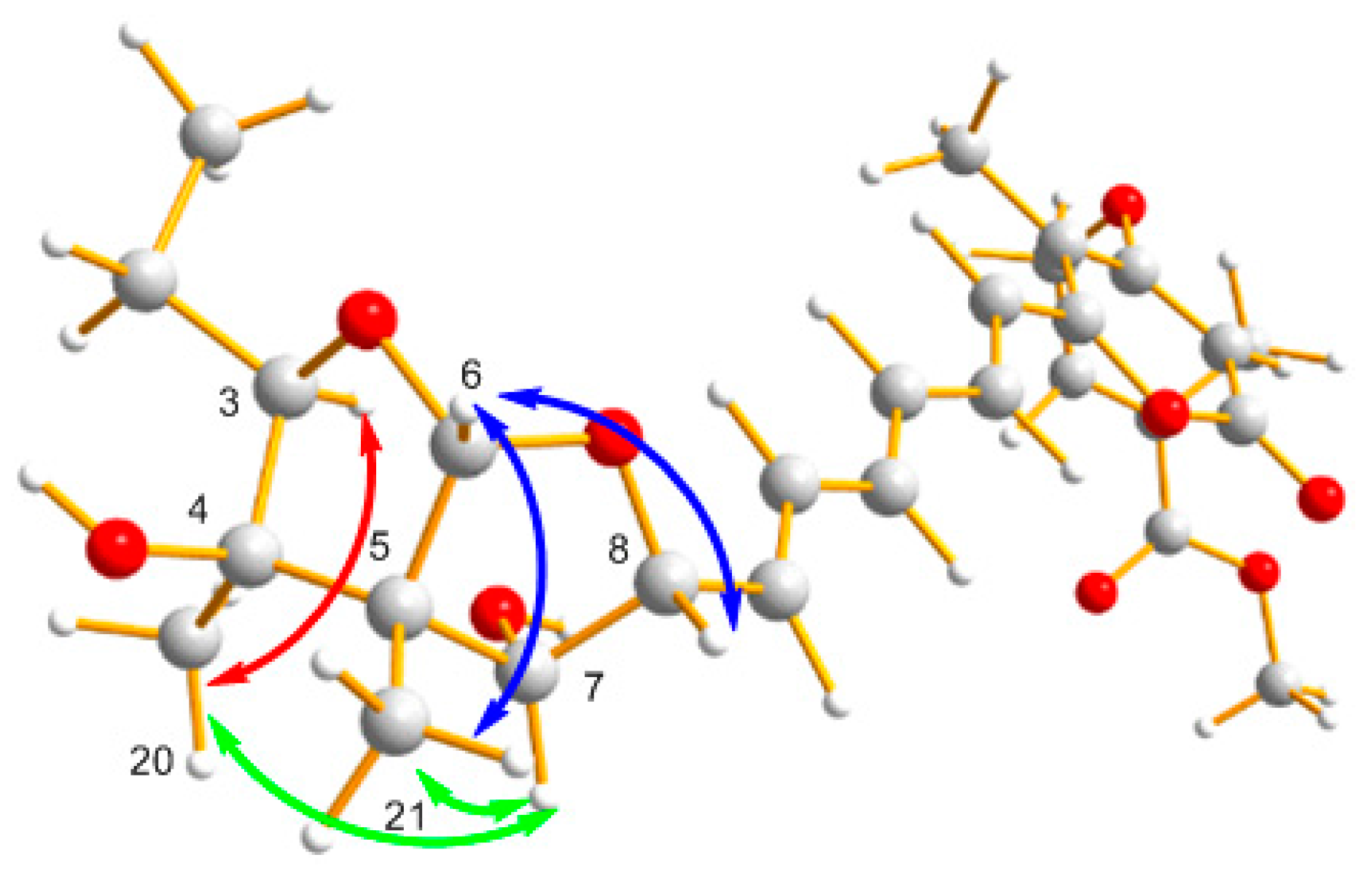 The relative stereochemistry of (2) was deduced from NOESY correlations as shown in Figure 3. The double-bond geometry of the C-25/C-26 of substituent was deduced from the NOESY correlations of H3-28/H2-27 and H-26/H3-23, which suggested E-configurations. The NOESY correlations of H-6/H3-21 revealed the cis fusion of the 2,8-dioxabi cyclo [3.3.0] octane. The NOESY correlations from H-6 to H-8; H-7 to H-8, H3-21 suggested that H-6, H-7, H-8 and H3-21 are positioned on the same side. The NOESY correlation of H-7/H3-20, as well as the lack of NOESY correlation between H3-20/H3-21, indicated that 4-OH was an α-configuration. The NOESY correlation of H3-20/H-3 indicated that the ethyl group at C-3 was in the α-configuration. So, the relative configuration of 2 would be identical with that of an asteltoxin and named asteltoxin E [18].