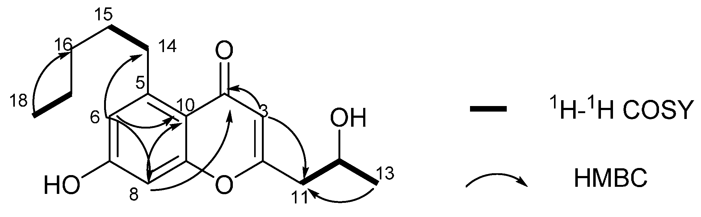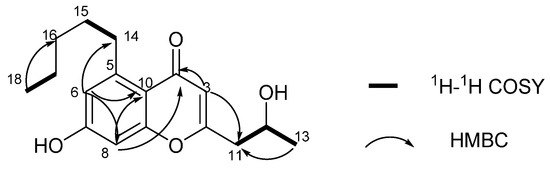 Compound 4 was obtained as needle crystal. The molecular formula of 4 was established as C17H22O4 by the HRESIMS ion peak at m /z 291.1588 [M + H]+ (calculated for C17H23O4, 291.1591) requiring seven degrees of unsaturation. The strong absorptions in the IR spectrum at 3354 and 1628 cm−1 showed the existence of a hydroxy group and a carbonyl group [19,20]. The 1H-NMR spectrum showed 20 proton signals, two sp3 aliphatic methy protons (δH 0.86 and 1.15), five sp3 methylene protons (δH 1.29, 1.29, 1.48, 2.57 and 3.08), one oxymethine proton (δH 4.03), and three sp2 methine protons (δH 5.95, 6.59 and 6.62). The 13C-NMR spectra showed 17 signals, comprising two methyls, five methylenes, four methines and six quaternary carbon atoms. Accounting for five of the seven degrees of unsaturation suggested the presence of two rings. The 1H- and 13C-NMR spectroscopic data of compound 4 indicate that it is a chromone analogue. The only difference from 5-carbomethoxy methyl-2 heptyl-7-hydroxy chromone was the substituent of C-5 [21]. The 1H-1H COSY correlation of H2-14/H2-15, H2-17/H3-18 and HMBC correlations of H3-18/C-16 and C-17, H2-15/C-16 and C-17 indicated the presence of a pentyl moiety. In addition, the HMBC correlation of H3-14/C-5, C-6 and C-10 suggested that the pentyl was located at C-5 (Figure 4 and Table 2).
