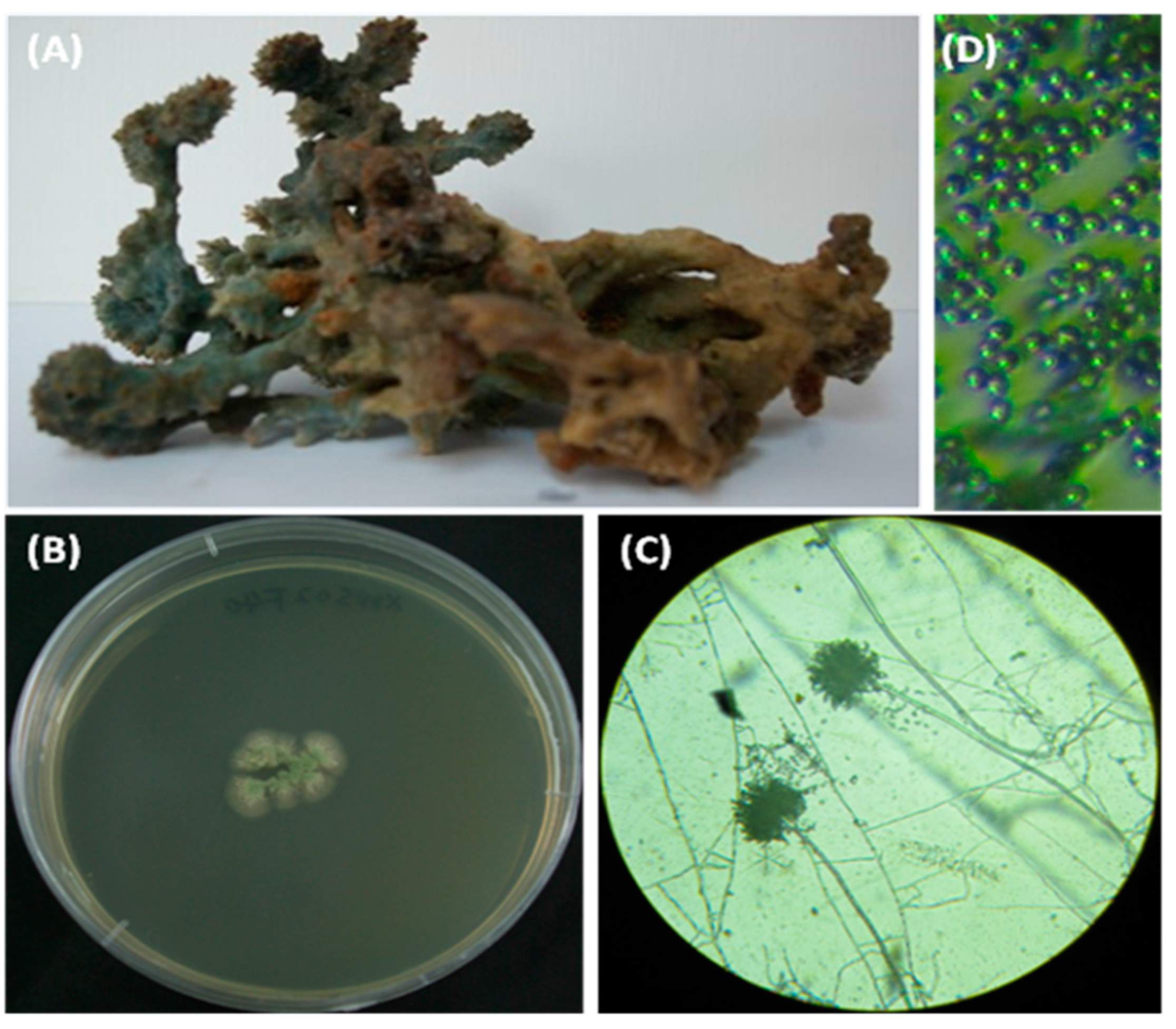 Figure 5. Colony appearance and micromorphology of Aspergillus sp. SCSIO XWS02F40 and the sample of the sponge Callyspongia sp. (A) sample of the sponge Callyspongia sp.; (B) colony appearance after seven days at 25 °C (MB medium); (C) conidiophores after seven days at 25 °C under a light microscope; (D) conidia as seen using a light microscope.
