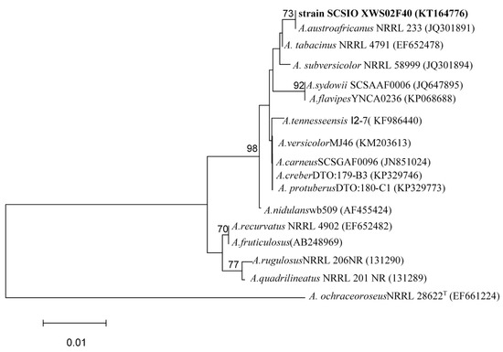 Figure 6. The neighbor-joining tree based on ITS1-5.8S-ITS2 sequences, showing a phylogenetic relationship between strain SCSIO XWS02F40 and related Aspergillus species. Only boot strap values >70% are shown. GenBank accession numbers are given in parentheses. Bar: 1% sequence divergence.
