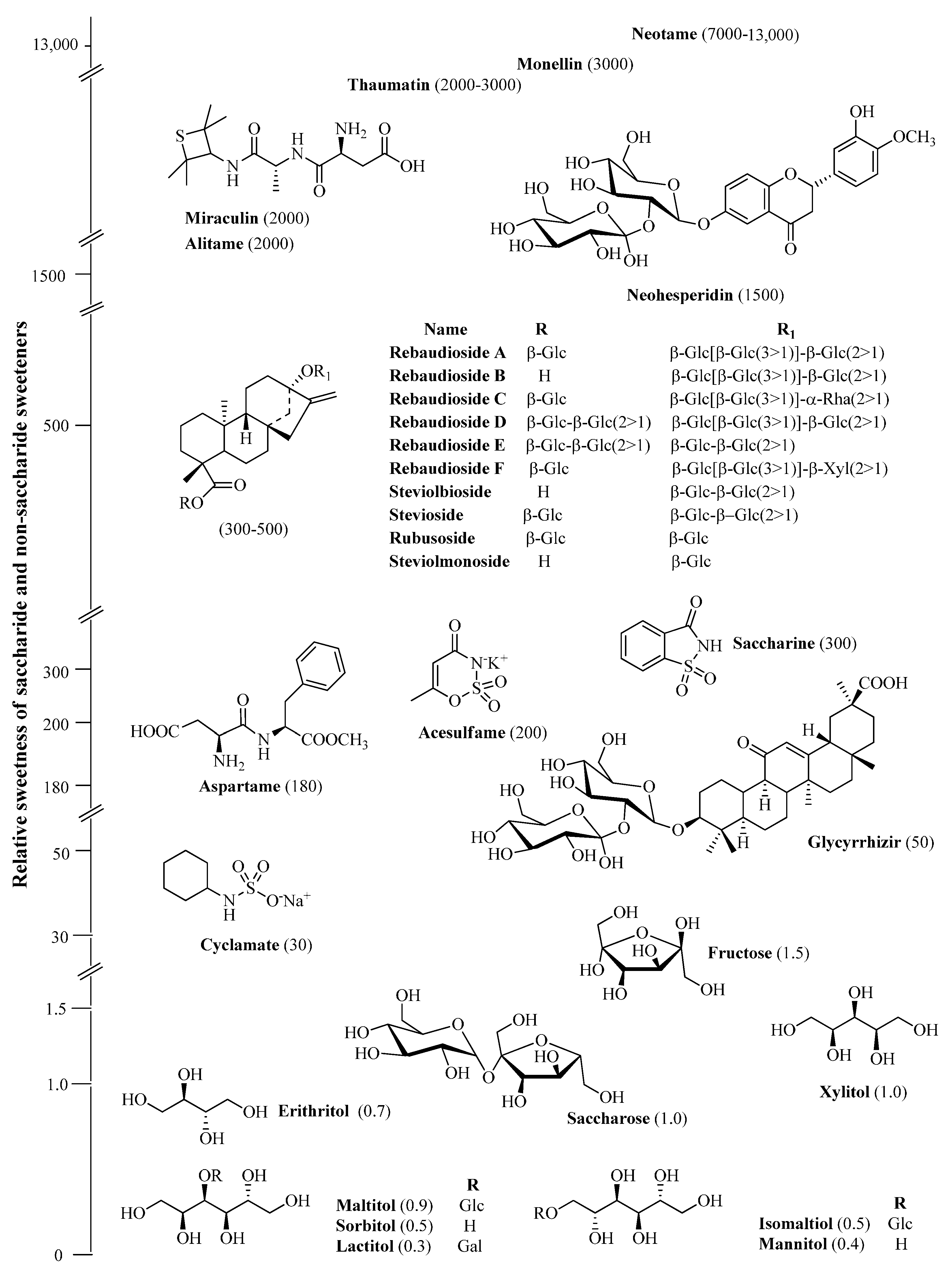 There are three types of S. rebaudiana-based products: the regular products, which consist mainly of a stevioside; the Reva A products, which consist mainly of rebaudioside A; and the sugar metastasis product. In the regular products, the content ratio of stevioside to rebaudioside ranges from 7:3 to 8:2, while in Reva A, this ratio is approximately 1:3. Since rebaudioside has a very sweet taste, the quality of sweetness for Reva A products is higher than regular ones [38]. Steviosides offer several advantages over other non-caloric sucrose substitutes: they are heat-stable, resistant to acid hydrolysis and non-fermentable [39].