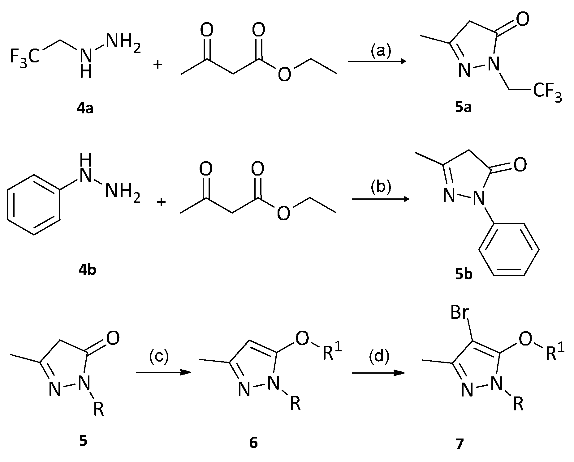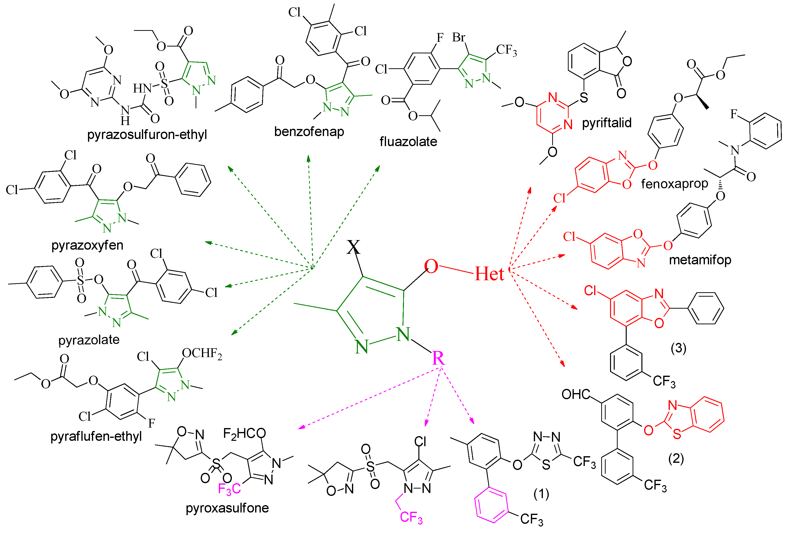 - Xu, H.; Hu, X.H.; Zou, X.M.; Zhu, Y.Q.; Liu, B.; Hu, F.Z.; Yang, H.Z. Synthesis and herbicidal activity of 5-heterocycloxy-3-substituted-1-(3-trifluoromethyl)phenyl-1H-pyrazole. Chem. Res. Chin. Univ. 2012, 28, 824–827. [Google Scholar]