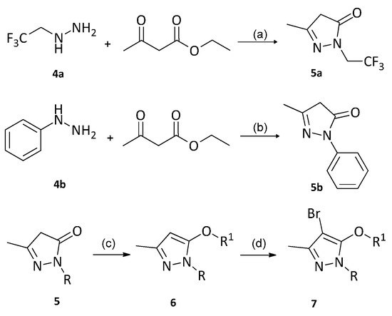 The synthetic route of a series of pyrazole derivatives were shown in Scheme 1. The chemical structures of fourteen target compounds were listed in Table 1. The structures of these compounds were confirmed by 1H-NMR (see Supplementary Materials), 13C-NMR (see Supplementary Materials), MS, Elemental analysis, and FT-IR. The compound 5b was synthesized according to the method of preparing 3,5-dimethyl-1-(2,2,2-trifluoroethyl)-1-H-pyrazole reported in the literature [29].