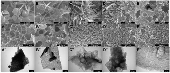 Effect of carbonization temperature on the formation or porous carbonaceous materials from human urine. SEM images of the mixture of carbon rock salts obtained at URC-X-BW, where X is (A) 700; (B) 800; (C) 900; (D) 1000, and (E) 1100 before washing with diluted HCl. Whereas (A′) SEM and (A′′) TEM images of URC-700; (B′) SEM and (B′′) TEM images of URC-800; (C′) SEM and (C′′) TEM images of URC-900; (D′) SEM and (D′′) TEM images of URC-1000; and (E′) SEM and (E′′) TEM images of URC-1100 after HCl washing, demonstrating the porous morphology of carbon obtained after the HCl treatment.