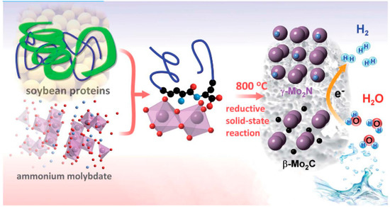 Design of a solid catalyst from soybeans and ammonium molybdate for electrochemical hydrogen production. A solid-state reaction between soybeans and the molybdate leads to their reductive carbonization and nitridation to form β-Mo2C and γ-Mo2N crystals. The structure of the amino moieties (blue balls) of soybean proteins is indicated. Plum balls: Mo, blue balls: N, black balls: C, and red balls: oxygen.