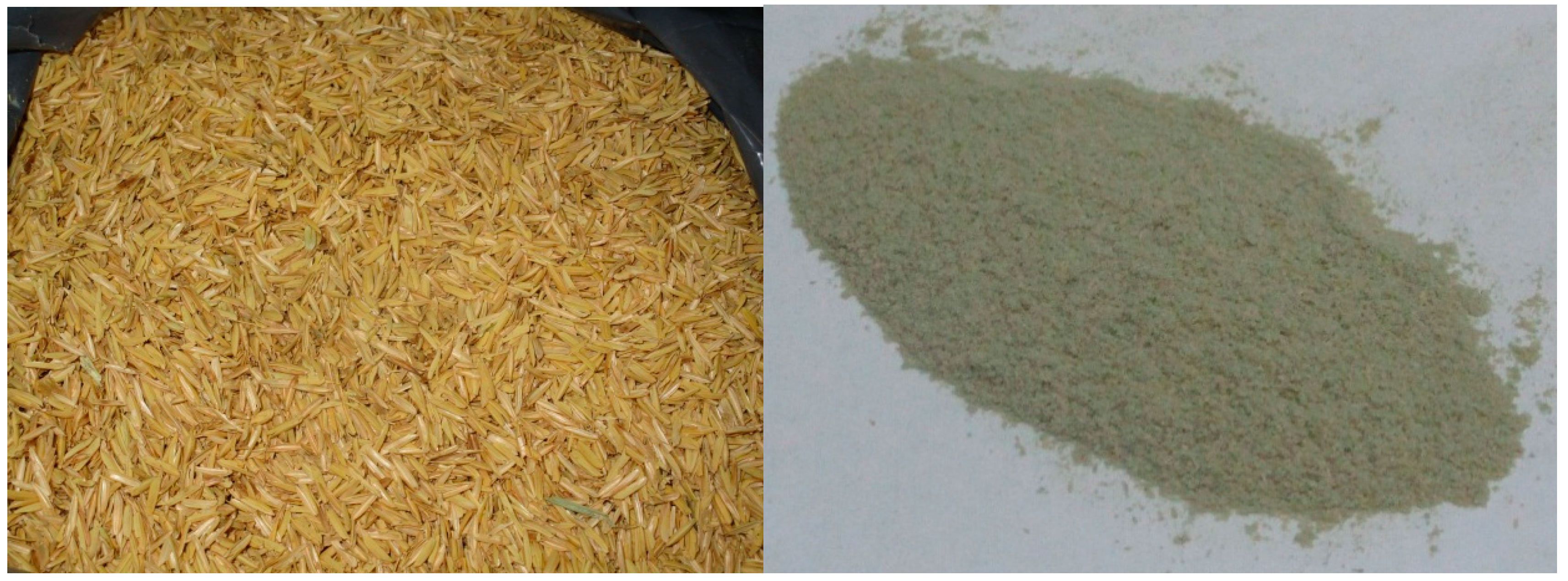 Pretreatment of rice husk (left image) to fine sieved powder (right image) via milling prior to processing.
