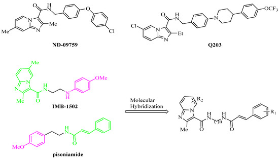 In recent years, imidazo[1,2-a]pyridine amides (IPAs) targeting the QcrB subunit of the menaquinol cytochrome c oxidoreductase (bc1 complex), which is a critical component of mycobacterial energy metabolism [8], have attracted broad attention due to their potent activity against MTB-resistant and -sensitive strains [9,10,11,12,13,14,15]. Two promising drug candidates, ND-09759 (Figure 1) and Q203 (Figure 1), are currently in pre-clinical and phase I clinical development [11,16], respectively. It has been generally accepted that the carboxamide linker with the N-benzylic group is critical for anti-MTB activity [12], but IPA derivatives containing a N-(2-phenoxyl)ethyl or N-(2-phenylamino)ethyl moiety, such as IMB1502 (Figure 1), were observed to have nanomolar potency against MTB H37Rv and MDR-MTB strains in our lab [17].