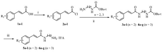 Synthesis of cinnamamide derivatives 5a–l and 6a–g. Reagents and conditions: (i) SOCl2, DMF, relux, 4 h; (ii) Net3, CH2Cl2, rt, 2 h, 59%–75% (for two steps); (iii) TFA CHCl3, rt, 1 h, 100%.