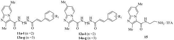 The target Compounds 11–14 were conveniently prepared from ethyl 2,6-dimethylimidazo[1,2-a]pyridine-3-carboxylate 7 and ethyl 2,7-dimethylimidazo[1,2-a]pyridine-3-carboxylate 8 [30,31], by hydrolysis in LiOH–EtOH and condensation with the above cinnamamide derivatives 5a–l and 6a–g in the presence of bis(2-oxo-3-oxazolidinyl)phosphonic chloride (BOP-Cl) and NEt3, successively (Scheme 2).