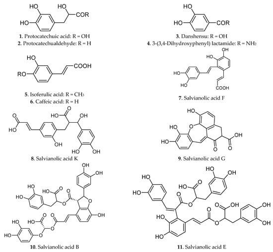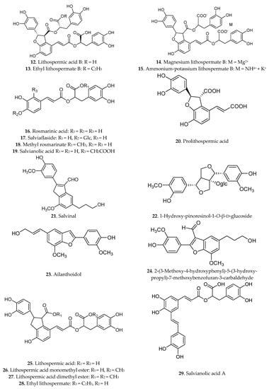 The phenolic acids have attracted the attention of scientists in the last 20 years because of their notable pharmacological activities and the conventional use of herbs by decocting with water. More than 30 phenolic acids (compounds 1–37) had been isolated from Danshen [,], as shown in Figure 2, including salvianolic acid A salvianolic acid B, salvianolic acid C, rosmarinic acid, protocatechuic acid, protocatechualdehyde, carnosol or danshensu, lithospermic acid and other derivatives.