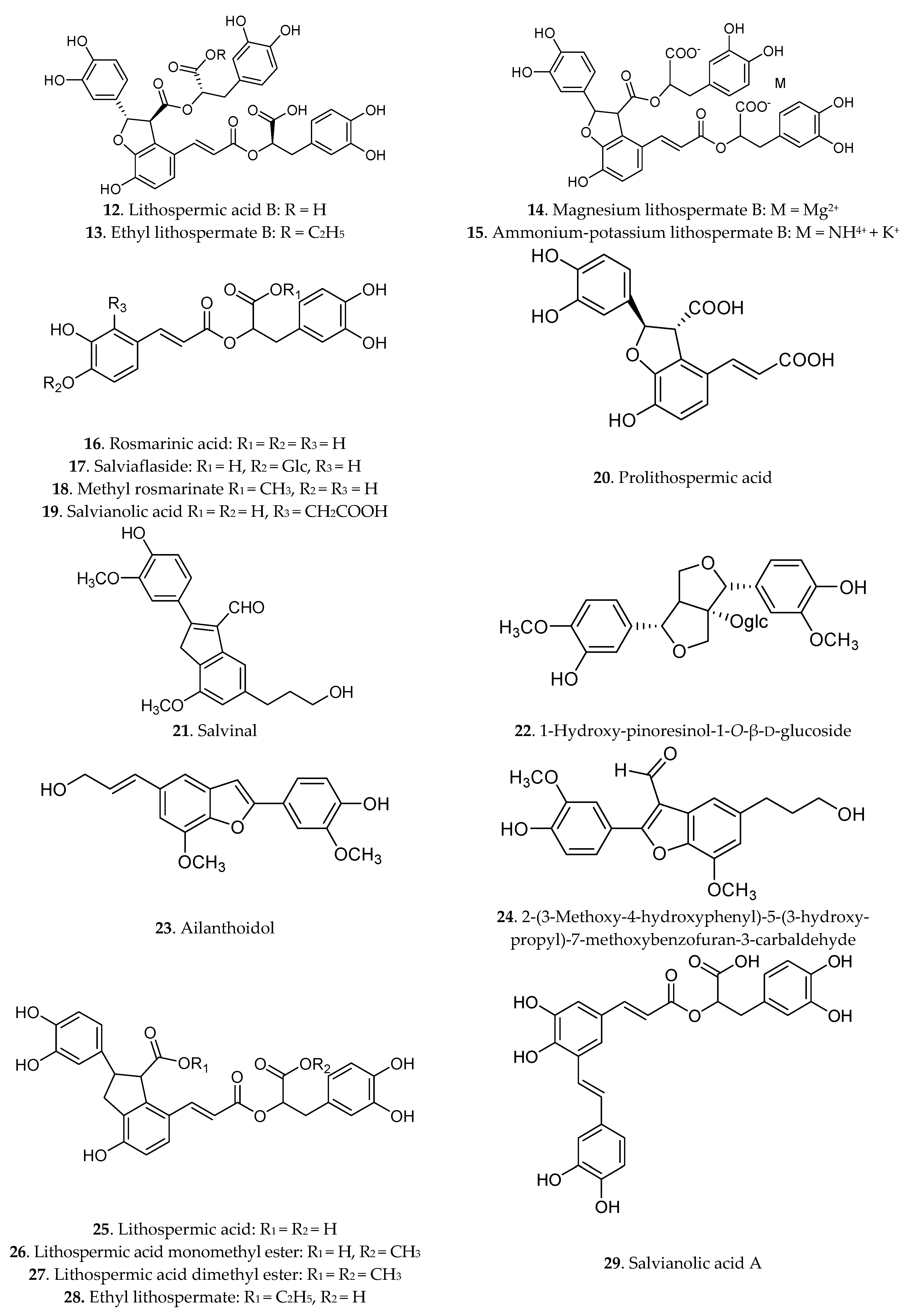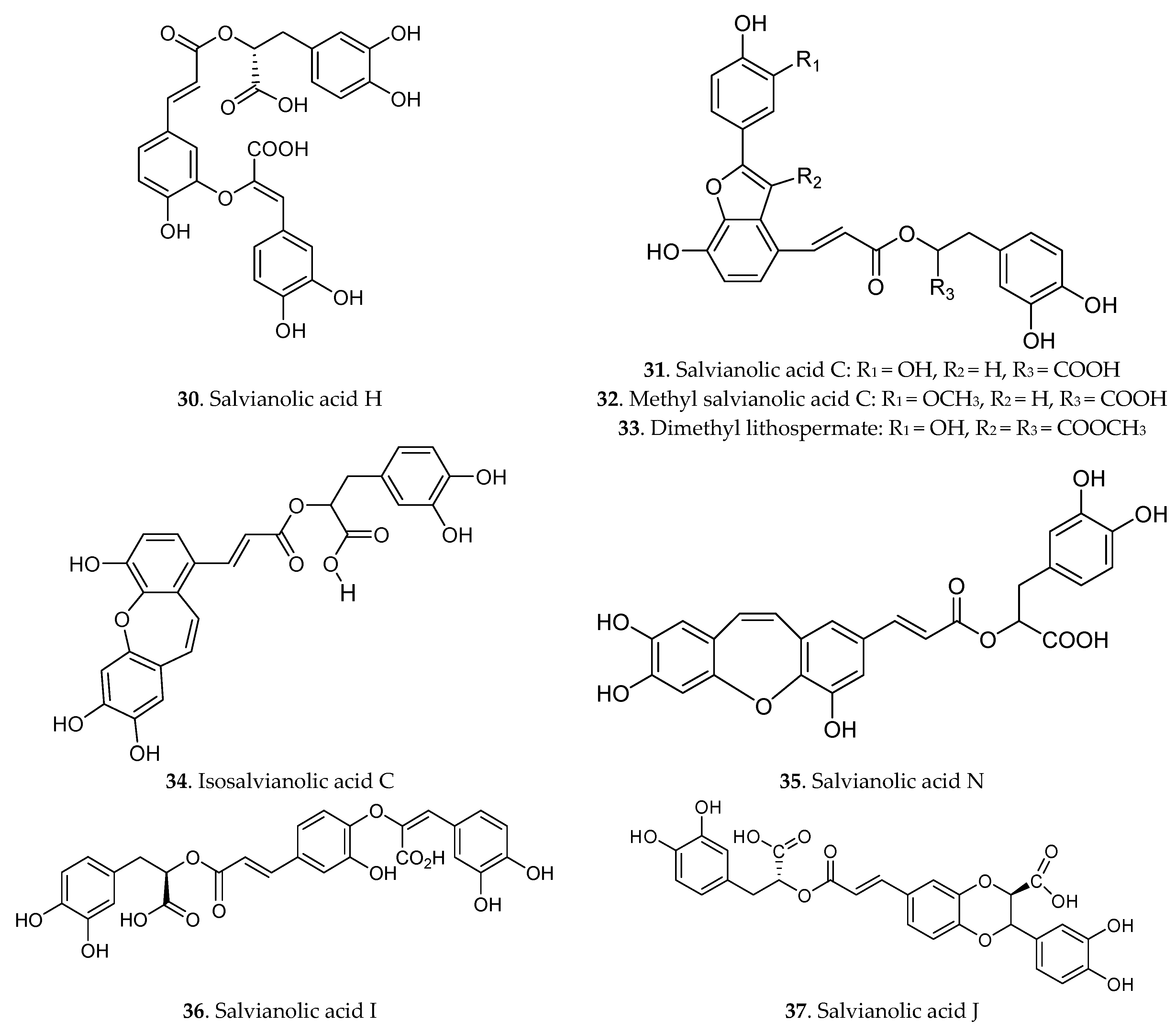 The phenolic acids have attracted the attention of scientists in the last 20 years because of their notable pharmacological activities and the conventional use of herbs by decocting with water. More than 30 phenolic acids (compounds 1–37) had been isolated from Danshen [8,25], as shown in Figure 2, including salvianolic acid A salvianolic acid B, salvianolic acid C, rosmarinic acid, protocatechuic acid, protocatechualdehyde, carnosol or danshensu, lithospermic acid and other derivatives.