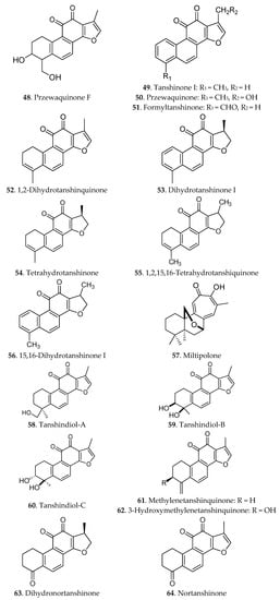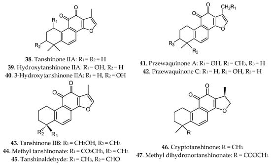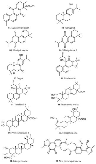 Terpenoids are another effective substance class in Danshen, and they are responsible for the colour of Danshen. So far, at least 40 liposoluble constituents (compounds 38–92) have been isolated from the official species of Danshen. The chemical structures of these diterpenoids [,] are given in Figure 3. Most diterpenoids were presented as tanshinones and their analogues containing tanshinone I, tanshinone IIA, cryptotanshinone, dihydrotanshinone, danshenxinkun A, przewaquinone A, tanshinol A, tanshinol B and others. Additionally, some triterpenoids were also isolated from Danshen [].