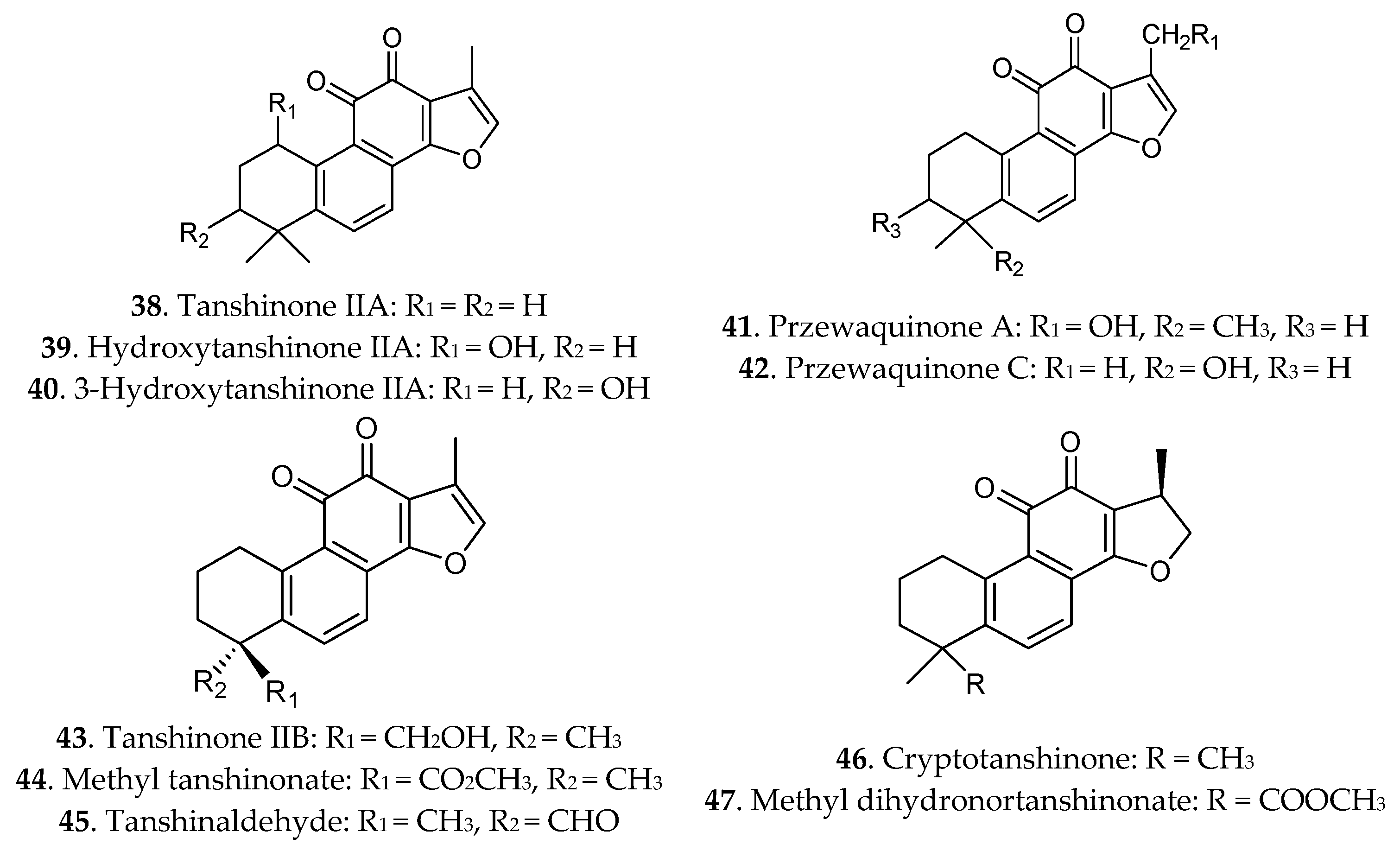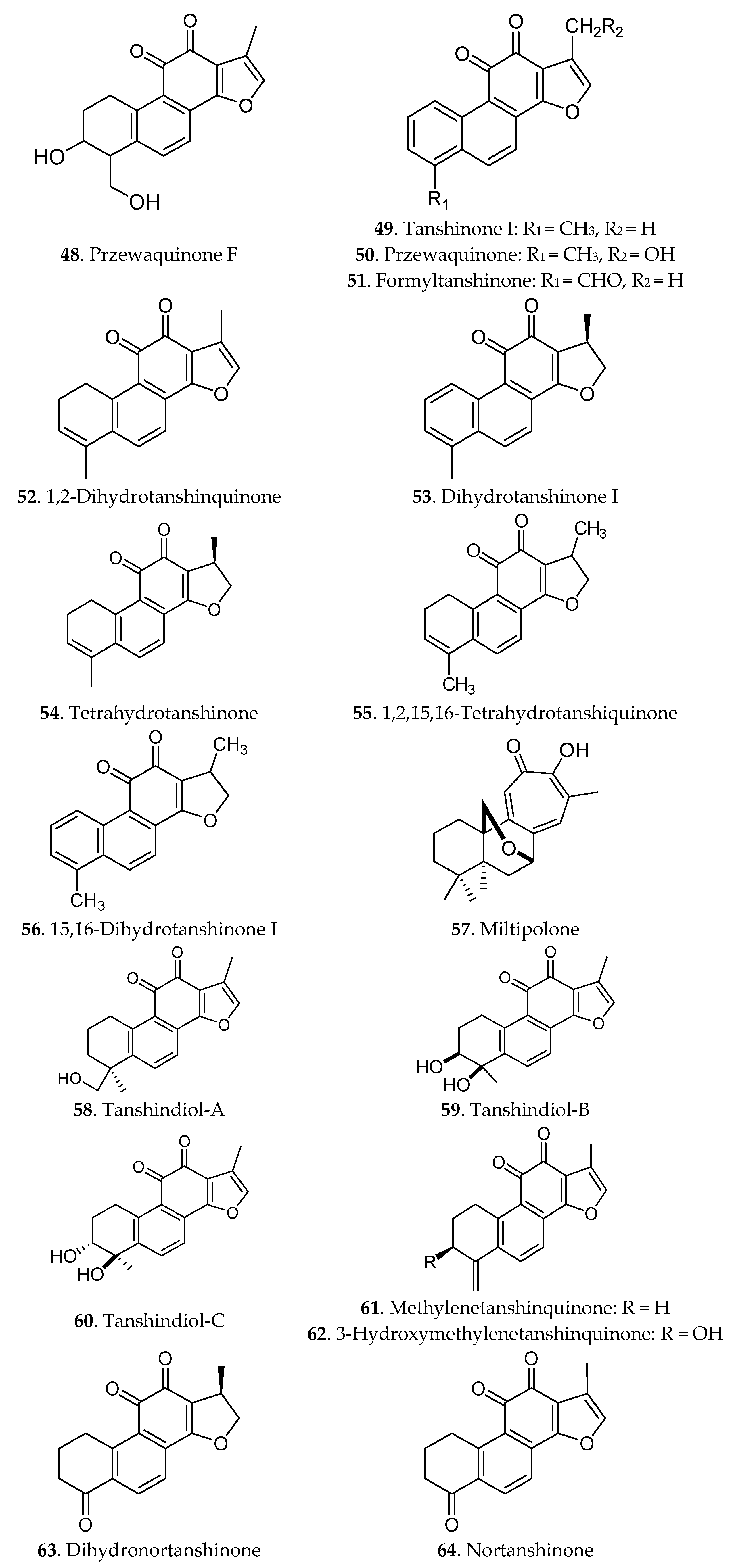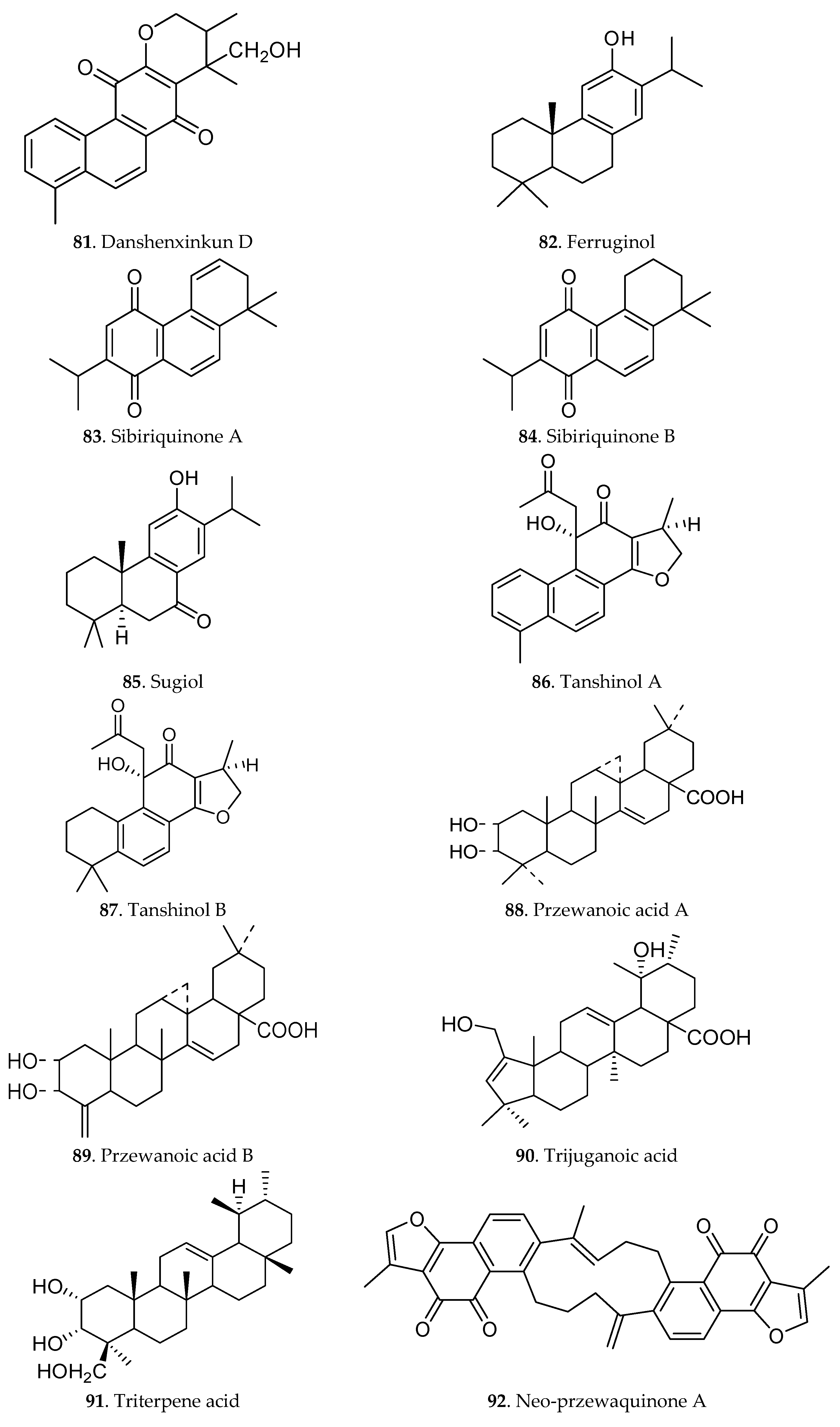 Terpenoids are another effective substance class in Danshen, and they are responsible for the colour of Danshen. So far, at least 40 liposoluble constituents (compounds 38–92) have been isolated from the official species of Danshen. The chemical structures of these diterpenoids [9,46] are given in Figure 3. Most diterpenoids were presented as tanshinones and their analogues containing tanshinone I, tanshinone IIA, cryptotanshinone, dihydrotanshinone, danshenxinkun A, przewaquinone A, tanshinol A, tanshinol B and others. Additionally, some triterpenoids were also isolated from Danshen [47].