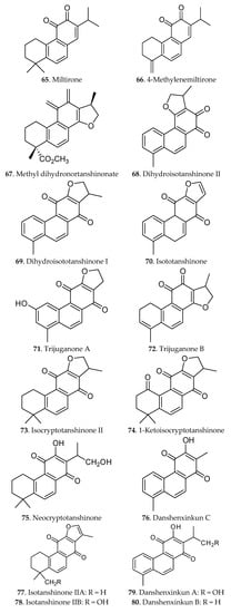 The tanshinones are unique chemical constituents in Salvia species, and similar compounds are not found in other TCMs []. Tashinones are comprised of four rings, including naphthalene or tetrahydronaphthalene rings A and B, ortho- or para-naphthoquinone or lactone ring C, and a furan or dihydrofuran ring D []. Among these, tanshinone IIA and cryptotanshinone, which are characterized by an ortho-quinone C-ring, were the most widely researched. Due to the low contents of tanshinones in Danshen, biotechnology strategies were applied to efficiently increase the yield of tanshinones from the cultured hairy roots [,].