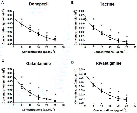 All drugs inhibited the activity of AChE in D. tigrina, in a similar way to trials conducted in experimental models with vertebrates. The lowest concentration did not inhibit the production of AChE compared to other concentrations, but D. tigrina was less sensitive to donepezil (0.011 μmol·min−1 at concentration of 25 μg·mL−1) (Figure 1A). Tacrine and rivastigmine had similar inhibitory activity (0.007 and 0.008 μmol·min−1 at a concentration of 25 μg·mL−1) (Figure 1B,C), and galantamine provoked more intense inhibitory effects with the production of AchE equal to 0.005 μmol·min−1 at a concentration of 25 μg·mL−1 (Figure 1D). The activity of AChE is significantly reduced by a concentration above 10 μg·mL−1.