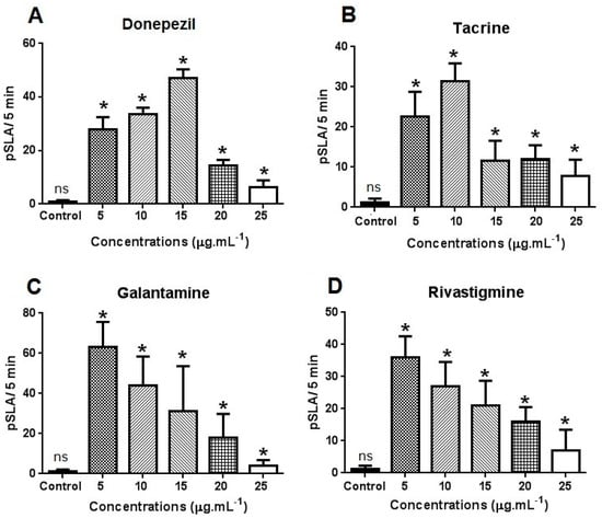 Effects of donepezil (A); tacrine (B); rivastigmine (C) and galantamine (D) on planarian seizure-like activity (pSLA) in Dugesia tigrina, after 5 min of exposure. Samples were tested in triplicate with 30 planarians in each Petri dish after 24 h of exposure. * Means differ by Dunnett’s test (p = 0.05).