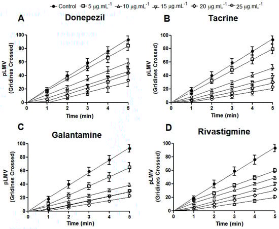 Effects of donepezil (A) tacrine (B); rivastigmine (C) and galantamine (D) on motility (planarian locomotor velocity (pLMV)) in Dugesia tigrina, after 5 min of exposure. Samples were tested in triplicate with 30 planarians in each Petri dish.