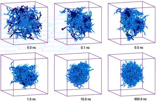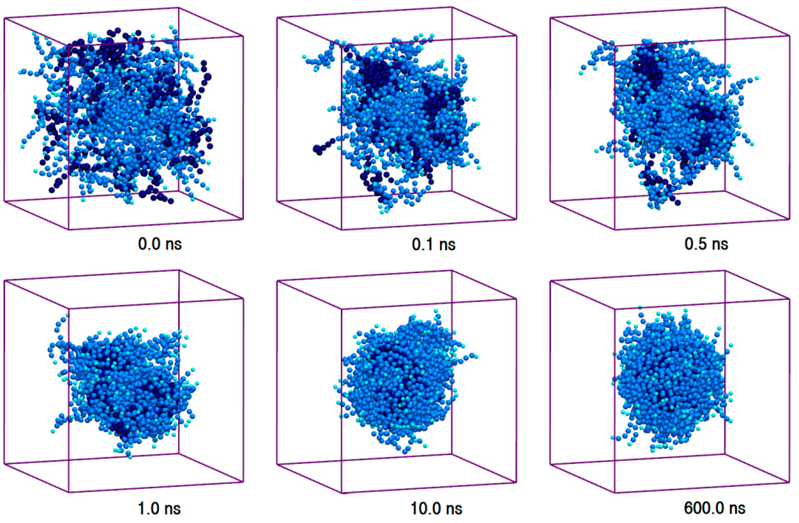 We studied the self-assembly and properties of P80 micelle in the aqueous medium. A system of 10 w% P80 in water was configured by randomly distributing 60 P80 molecules in 9817 CG water particles, and the production simulation was run for 600 ns (Table 1, Simulation 2). The selected trajectory snapshots of P80 self-assembly are illustrated in Figure 1, and the corresponding animation is provided in Supplementary Materials 2, Video S1. As can be seen, the randomly dispersed surfactant molecules (t = 0) self-assemble to two distinct clusters within 0.1 ns. The individual clusters become more packed during the next 0.3 ns. The clusters are then fused to each other (t = 1.0 ns) to minimize water-hydrocarbon contact, leading to the formation of a micelle containing all individual surfactant molecules (P8060). The plot of energy evolution (Supplementary Materials 1, Figure S2a) shows that the micelle reaches equilibrium state within around 3.0 ns, and remains energetically stable until the end of simulation.